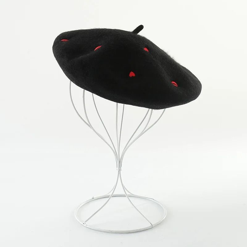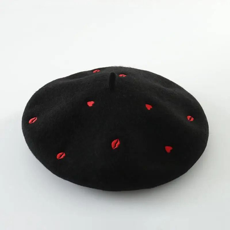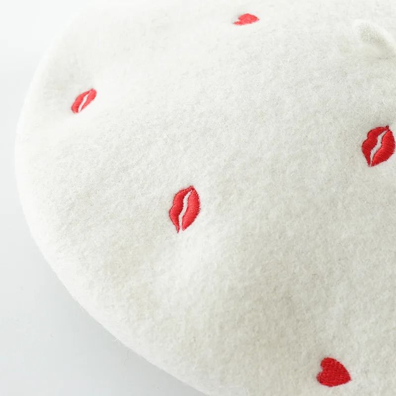 Chic Wool Beret with Embroidered Red Hearts & Lips