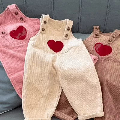 Kids Spring Corduroy Suspender Overalls with Heart Embroidery